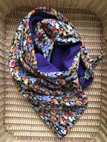 Dimensions : 150 de large sur 75 au niveau de la pointeTexture : Douce, fluide et légèreMotif : Gaze de coton Unie violette / imprimé floral