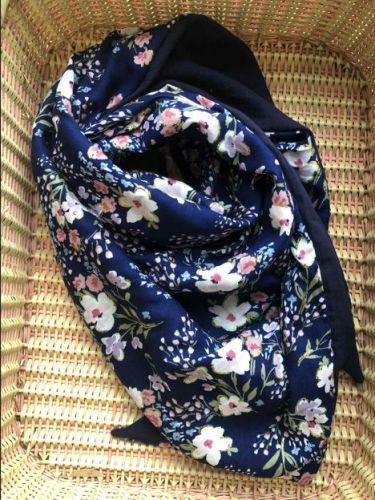 Dimensions : 150 de large sur 75 au niveau de la pointeTexture : Douce, fluide et légèreMotif : Gaze de coton Unie bleu marine / imprimé floral